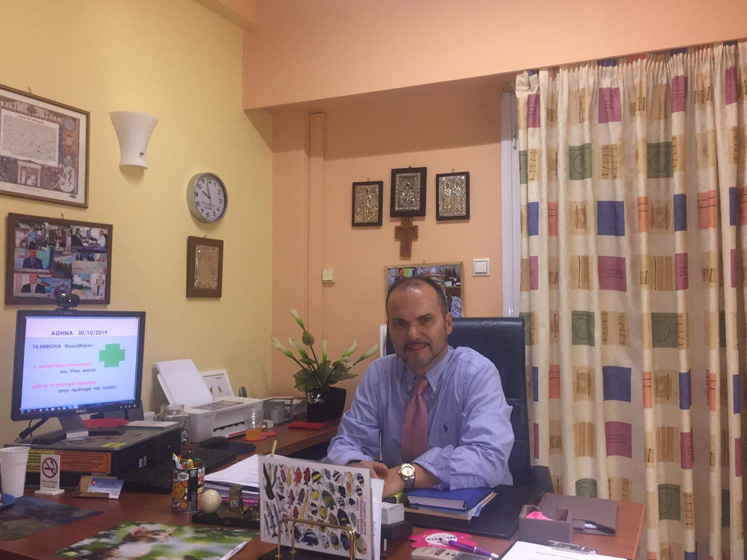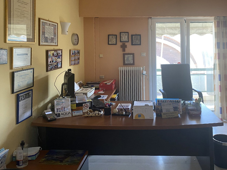 Το Ιατρείο του είναι έτσι σχεδιασμένο ώστε η επίσκεψη στο γιατρό να είναι ευχάριστη και να μη δημιουργεί αίσθημα φόβου. Ο χώρος είναι λειτουργικός: το παιδί ενθαρρύνεται να παίξει, να ζωγραφίσει , ενώ παράλληλα υπάρχει δυνατότητα απομόνωσης των εμπύρετων παιδιών ή των βρεφών από τα μεγαλύτερα παιδιά.
